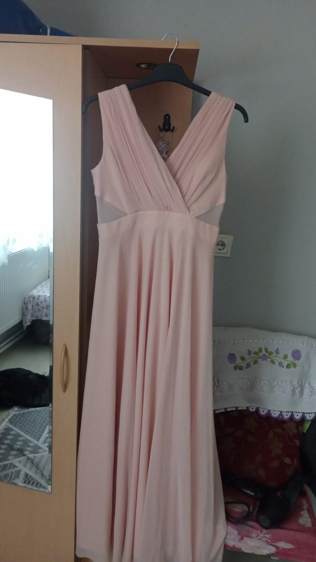 Pudra Renkli Drapeli Uzun Elbise