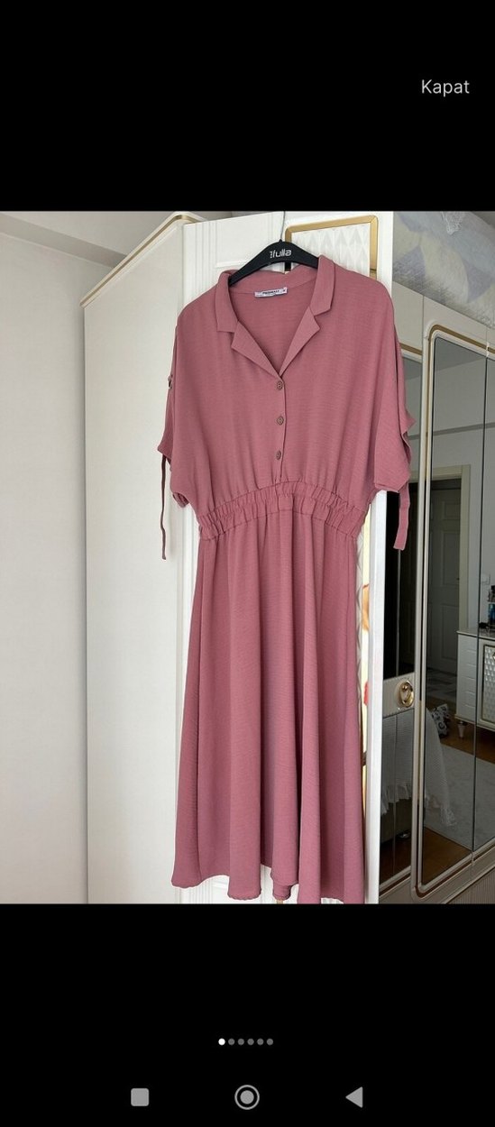 Pudra renginde, düğmeli ve V yaka detaylı uzun, bol kesim elbise. Kısa kollu ve yumuşak sentetik kumaş