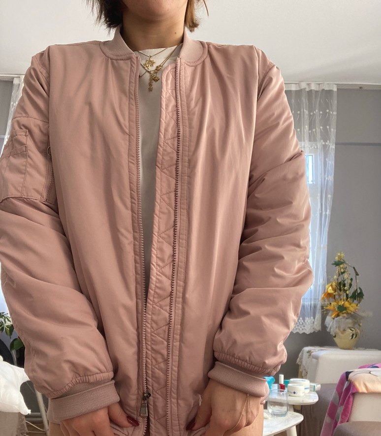 Pudra renkli, rahat kesim ve uzun kollu bu ceket, yüksek yakalı ve fermuarlı tasarıma sahip. Günlük kullanıma uygun midi boyda, yumuşak sentetik kumaştan yapılmıştır.