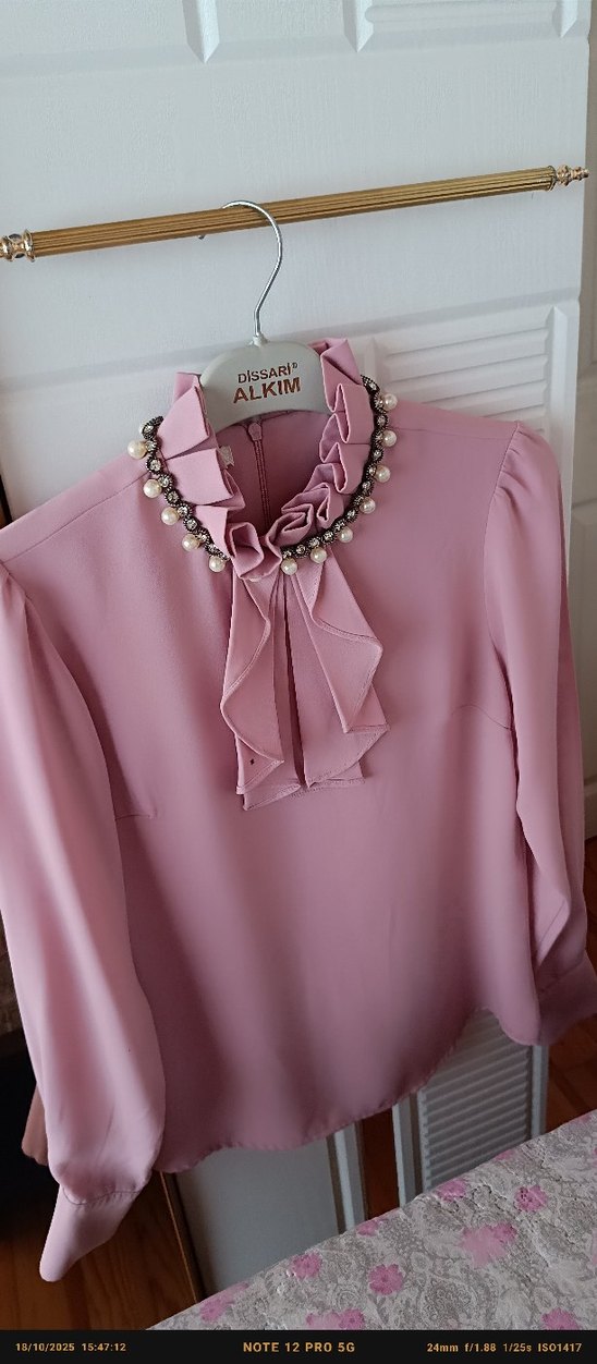 Pudra renkli, ipeksi kumaştan yapılmış kadın gömleği, yakasında fırfır ve inci detayları bulunur. Uzun kollu, bol kesim ve ofis için uygun bohem tarzda. arka kısmında ufak bir ütü izi var hiç belli olmuyor kırışık gibi duruyor.
