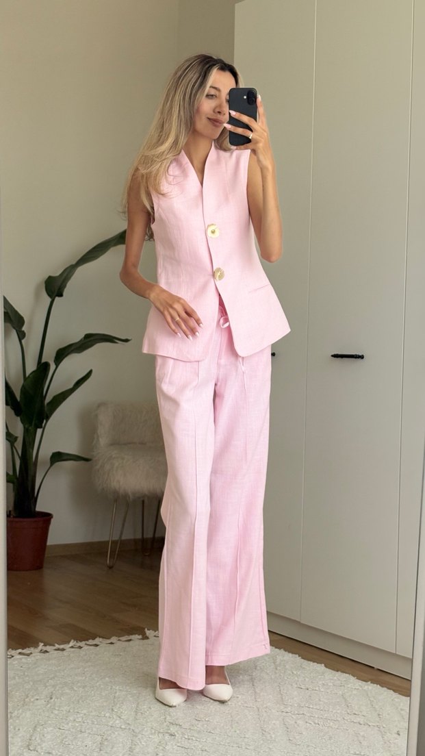 Pudra renkli keten kumaştan yapılmış, uzun ve kolsuz, kesimli yaka ve düğmeli kadın takımı. Rahat kesimiyle ofis kullanımı için uygundur.