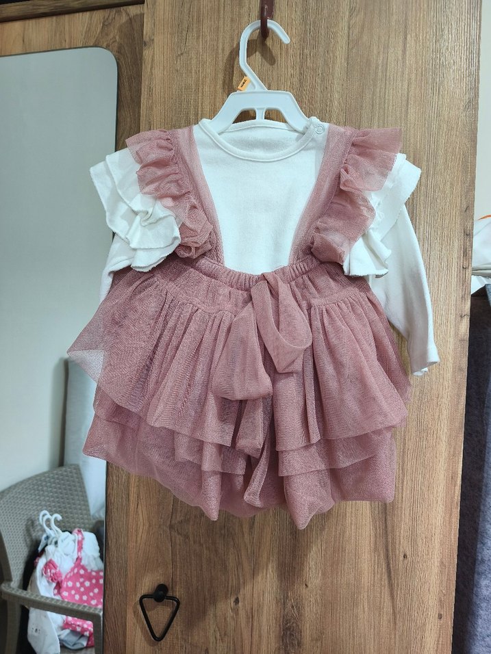 Pudra renkli fırfırlı detaylara sahip, bol kesim kız çocuk elbisesi, yumuşak sentetik kumaştan yapılmıştır.