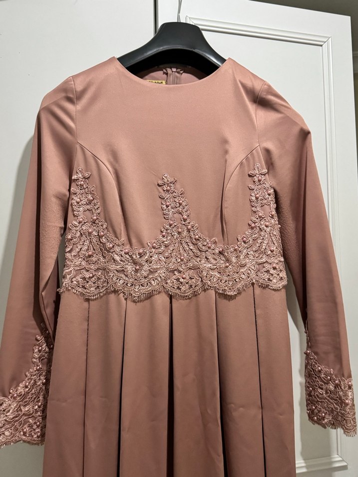 pudra renkli, uzun kollu ve yuvarlak yakalı abiye elbise. Bel ve kol uçlarında nakış detayları bulunan, vintage esintili modern klasik tarzda, düğün için uygun şık bir model.tesettüre uygun