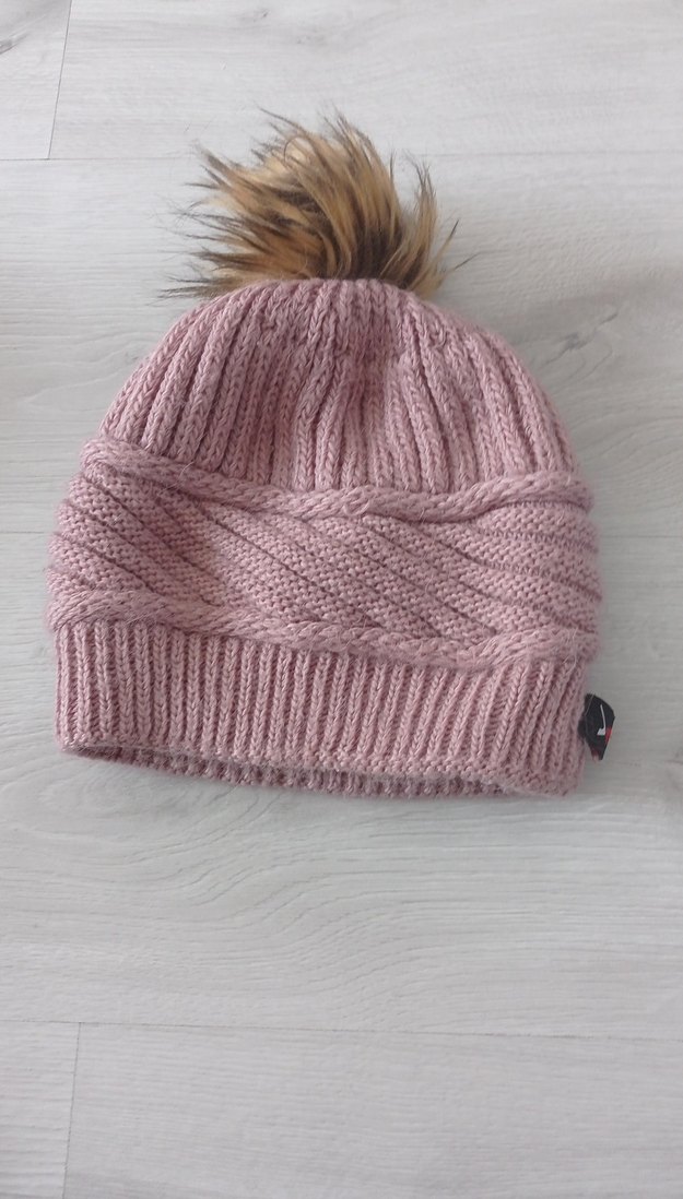 Pudra renkli kadın bere, örgü dokusu ve suni kürk ponponuyla sıcaklık ve şıklığı bir arada sunar. ❄️