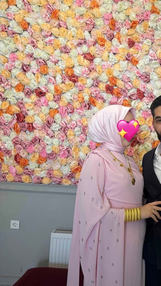Pudra tonlarında, payetlerle süslenmiş, etnik desenli, uzun ve tesettürlü nişan elbisesi. Fitted kesim, halter yaka ve askılı kollara sahip, bohem tarzda. Ürün 30 eylülden itibaren şatışta eger isterseni 2 metre janjan şal verilir