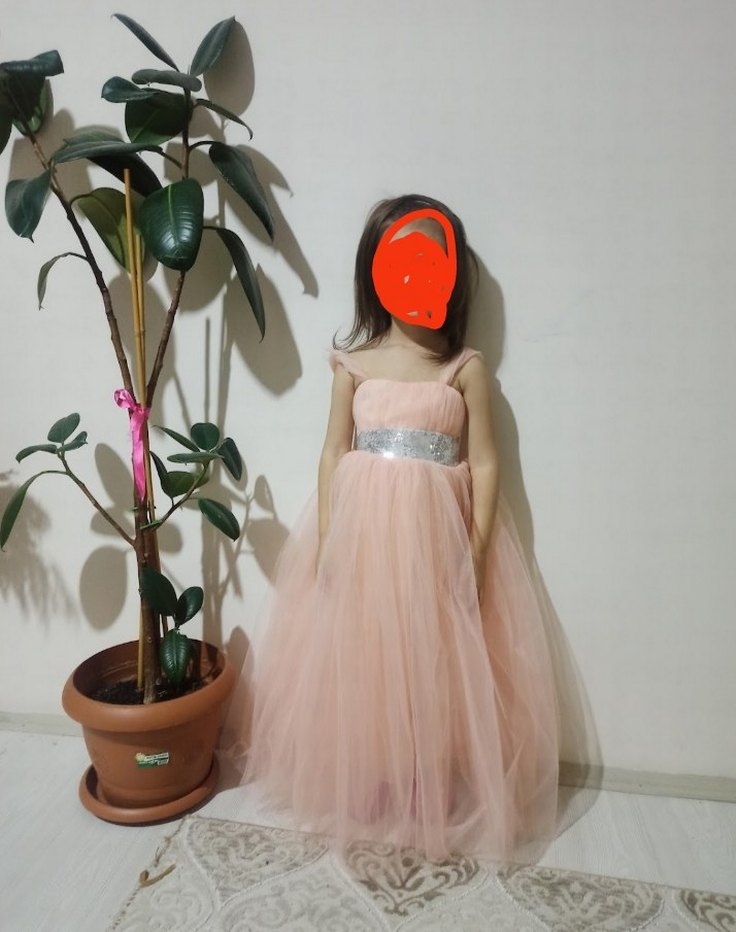 Pudra renkli kız çocuk elbisesi, askılı üst kısmı ve pilili etek yapısıyla şık bir görünüm sunar. Straplez yaka ve gümüş payetli bel detayı vardır.