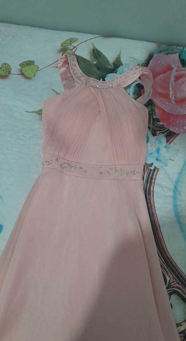 Pudra pembe renkte, pilili detaylara sahip straplez ve kolsuz uzun abiye elbise. Boncuk işlemeli yakası ve klasik şıklığı ile düğünlere uygundur.