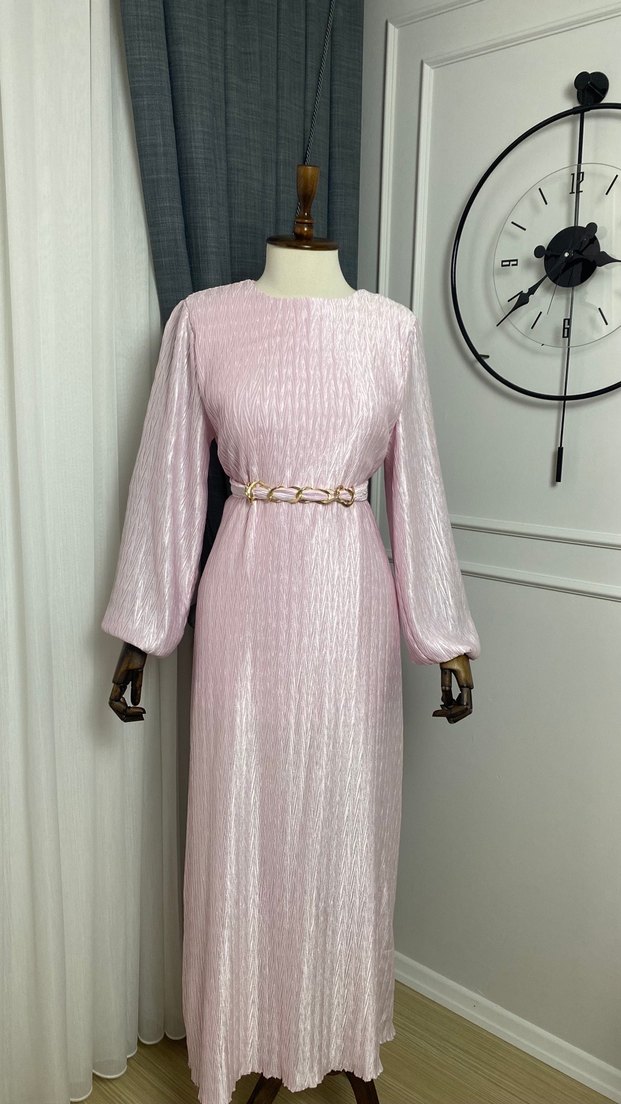 Pudra renginde, pilili uzun abiye elbise. Kayık yaka ve askılı kollu, düzenli kesime sahiptir. Düğünler için uygundur.