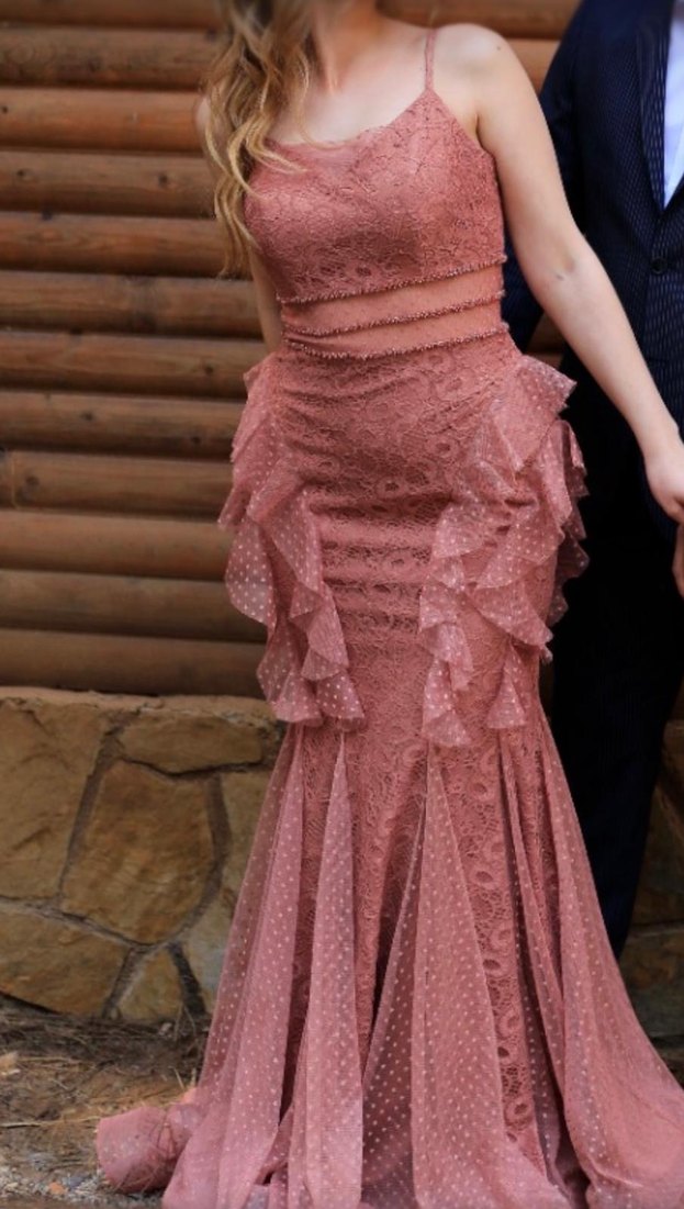 Pudra renkli, uzun ve vücuda oturan bu nişan elbisesi, fırfır detayları ve straplez yakasıyla klasik zarafeti bohem tarzla buluşturur. Desenli kumaşıyla düğünler için ideal, pastel ve göz alıcı bir modeldir. Nişanımda kullanmıştım sorunsuz marka temsilidir