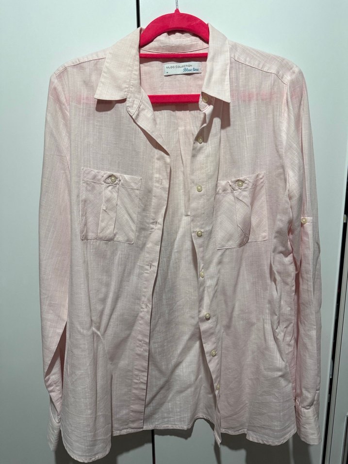 Pudra renkli, uzun kollu keten gömlek, yakalı ve düğmeli ön tasarıma sahiptir. Rahat kesimi ve iki cep detayıyla günlük sokak stiline uygundur. Slim fit kesimdşr