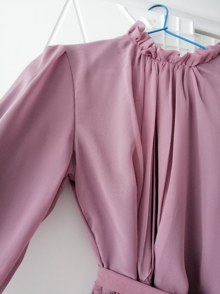 Pudra renkli, uzun kollu ve pilili detaylara sahip kadın elbisesi, yüksek yakalı ve bol kesimdir. Kadifemsi kumaştan yapılmış, minimalist ve çağdaş tarzdadır.