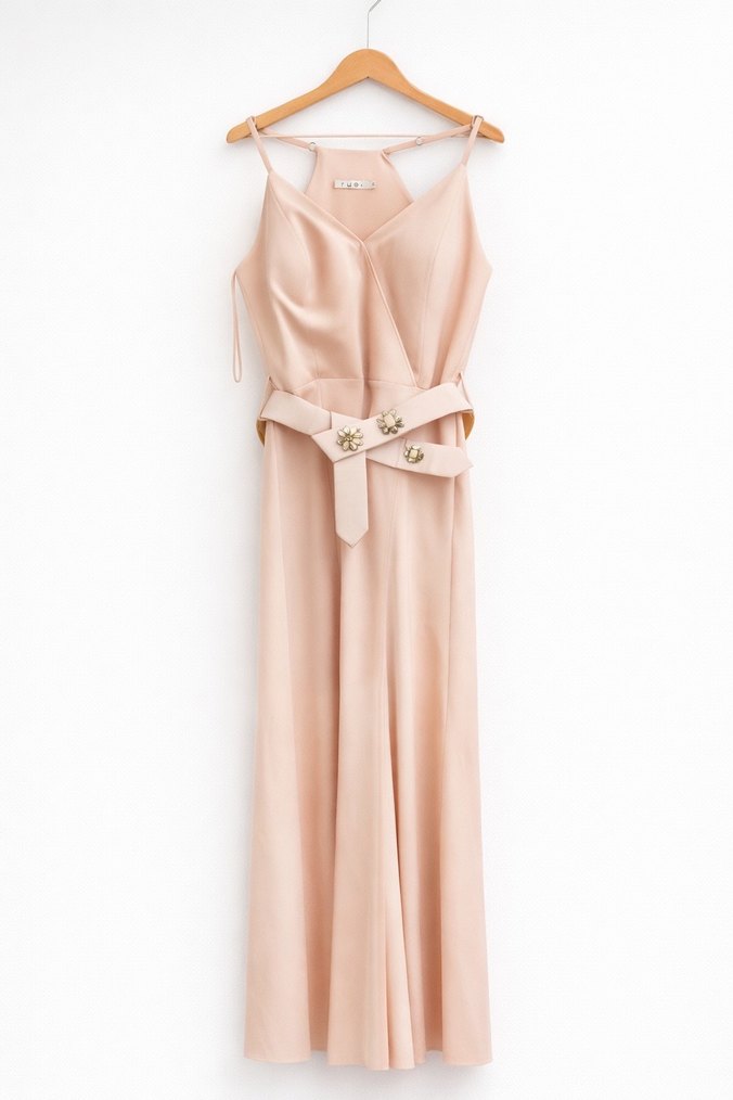 Pudra renkli, saten dokulu, uzun ve kemerli elbise. Askılı, straplez yaka ve klasik kesim ile düğünler için uygun.