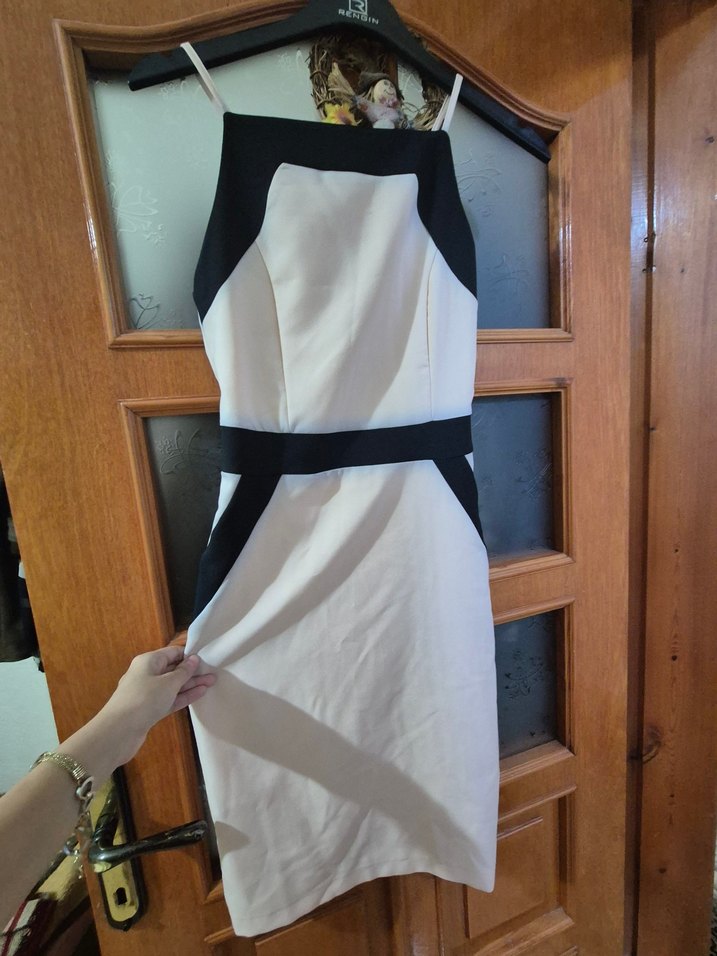 İnce askılı, fit kesim midi elbise, pudra pembe ve siyah kontrast geçişli kumaştan ofis ve gece için modern bir tarz sunar.