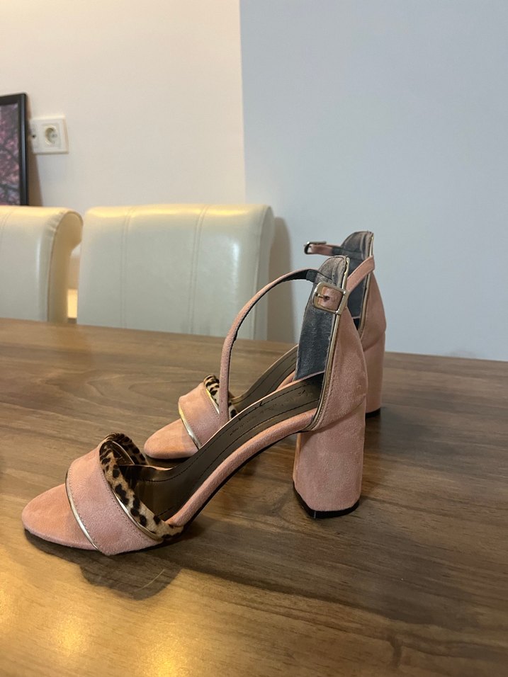 Pudra süet malzemeden, yılan desenli detaylara ve tokalı kayışa sahip blok topuklu kadın ayakkabısı, romantik akşamlar için uygun.