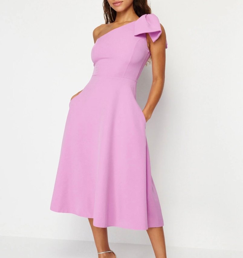 Pudra rengi midi boy kokteyl elbisesi, tek omuz askılı ve drapeli fiyonk detayıyla klasik ve çağdaş bir stil sunar. Romantik akşamlar için uygundur.