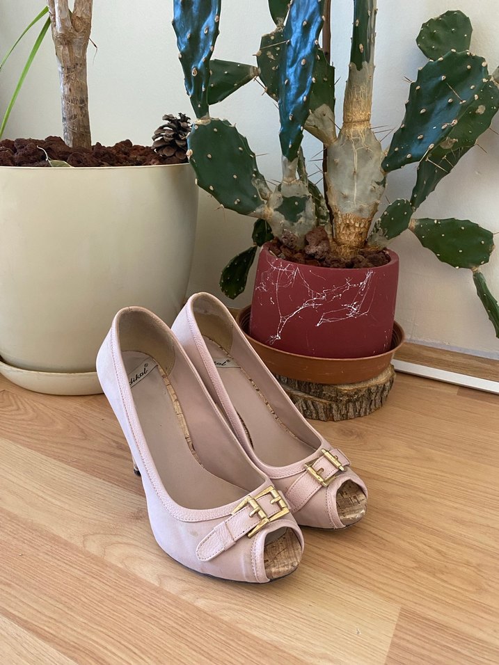Kumaş malzemeden yapılmış, tokalı ve stiletto topuklu kadın ayakkabısı. Pastel tonlarda, açık burunlu modern klasik stil. Romantik akşamlar için uygun.