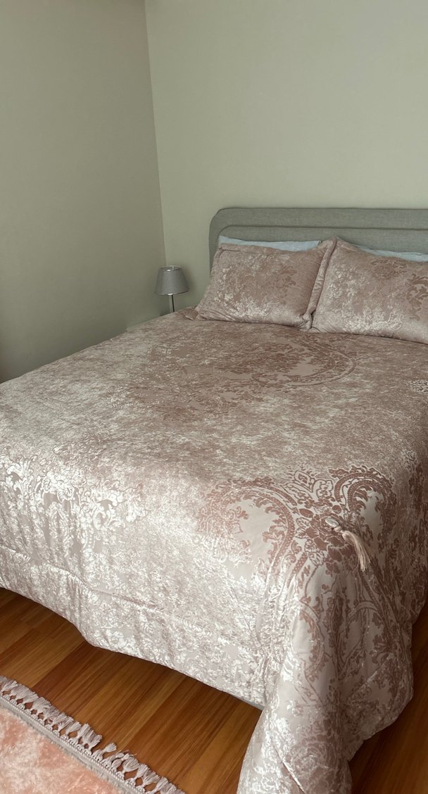 Pudra tonlarında batik desenli, yumuşak dokulu ve şık yatak örtüsü. 1 aylık evliyim 2 defa kullandım ben 8 bine aldım İstanbul Anadolu yakası elden teslim edebilirim