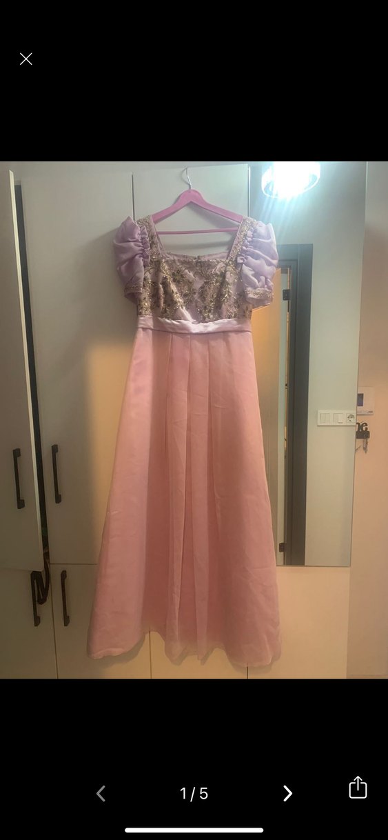Özel dikim elbisedir, Uzun, pastel pembe renkli, bol kesim ve drapeli tasarıma sahip kadın abiye elbisesi. Askısız ve kolsuz, vintage ve klasik şıklıkla düğünler için uygun. Etek kısmında ufak bir sökülme mevcut ama drapeli bir elbise olduğu için belli bile olmuyor