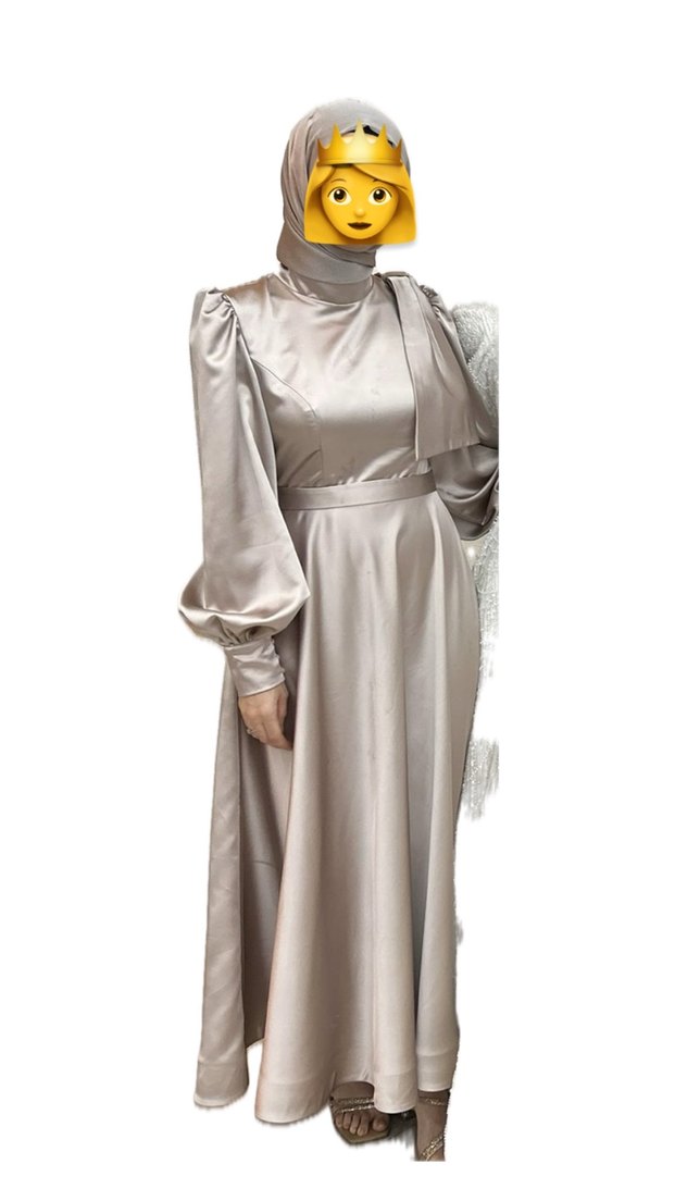 Pudra uzun, drapeli, yüksek yakalı ve uzun kollu kadın elbisesi. Düz ve vücuda oturan kesimi ile düğünler için uygun. Özel dikim bir kere davette giyildi yıkama yapıldı ter temiz bir sorunu yok. Şalı da hediye