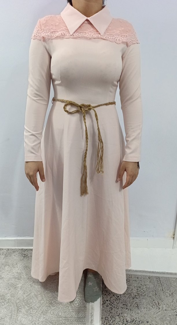 pudra Uzun Elbise, Kemerli, Kayık Yaka