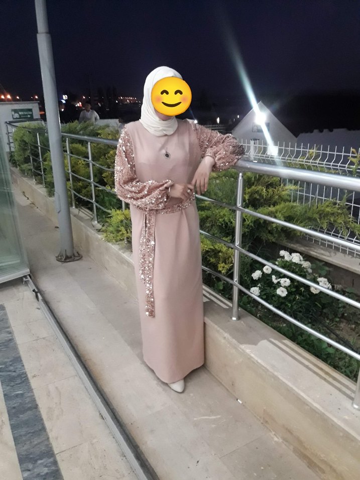 Az kullanıldı.38 beden.Pudra renkte, yüksek yakalı ve uzun kollu drapeli uzun elbise. Düzenli kesim, düğünlere uygun.