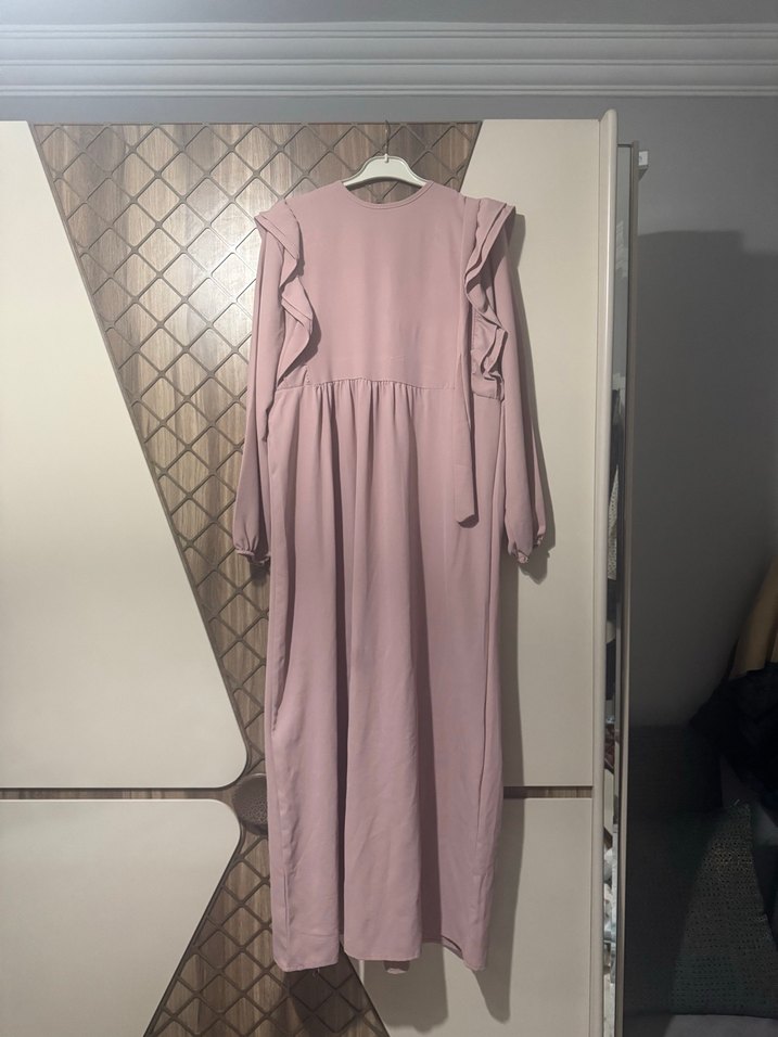 Yumuşak keten kumaştan, uzun kollu ve fırfır detaylı, bol kesim pudra uzun elbise. Yuvarlak yaka ve sade, mütevazı tasarım sunar.