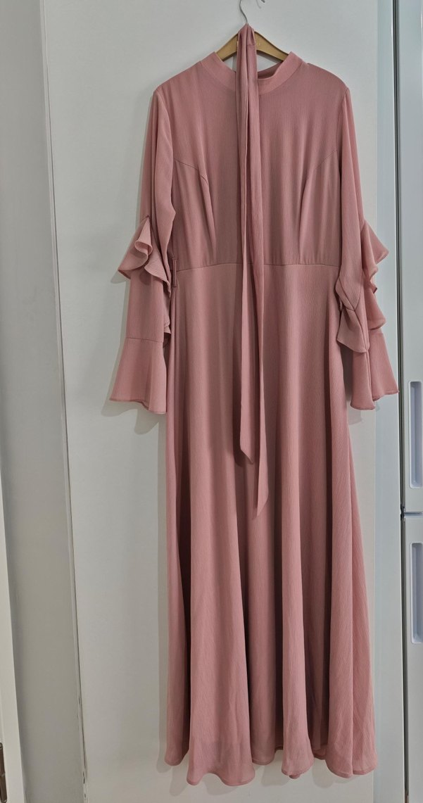 Bej renkte, uzun kollu ve yüksek yakalı bu uzun elbise, fırfır detayları ve bol kesimiyle ipeksi kumaştan yapılmıştır. Modern klasik tarzda, düğünler için uygundur.