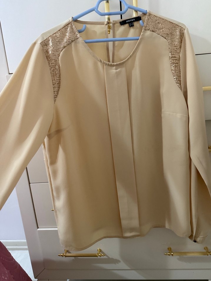 Pudra renkli, uzun kollu,kadın bluz. Drapeli ve parlak payet omuz detaylarına sahip, yuvarlak yakalı ve normal boyda.