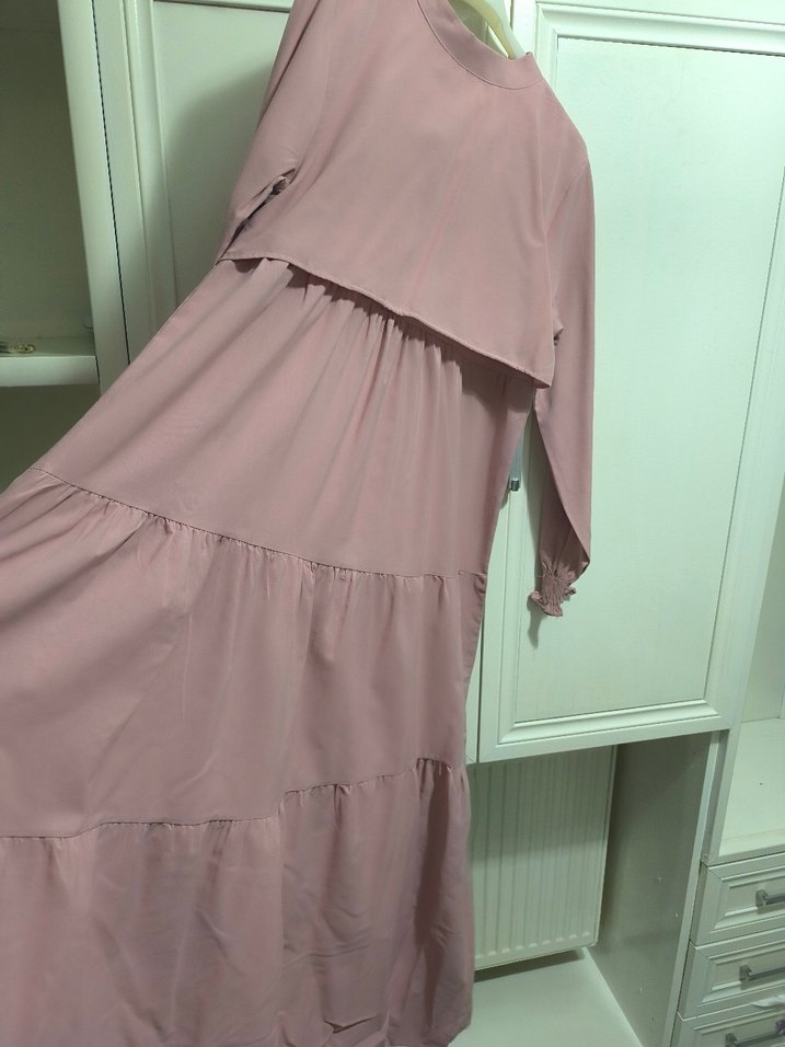 Pastel pudra renkte, yüksek yakalı, bol kesim uzun elbise. Kat kat ve fırfırlı detaylara sahip, yumuşacik kumaştan üretilmiştir. 44 beden tesettür elbise