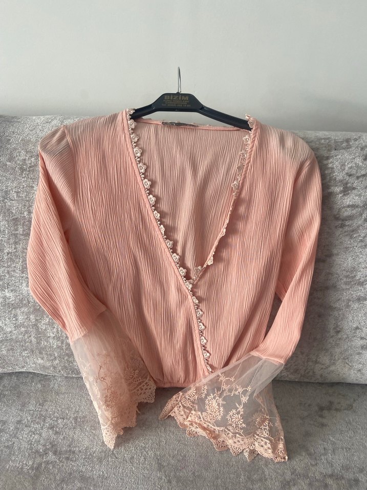 Pudra renkte, V yaka ve uzun kollu, dantel detaylı kadın bluz. Yumuşak keten kumaştan, bol ve kısa kesimdir. Bohem tarzını yansıtır. Sayılı kullanıldı tertemizdir
