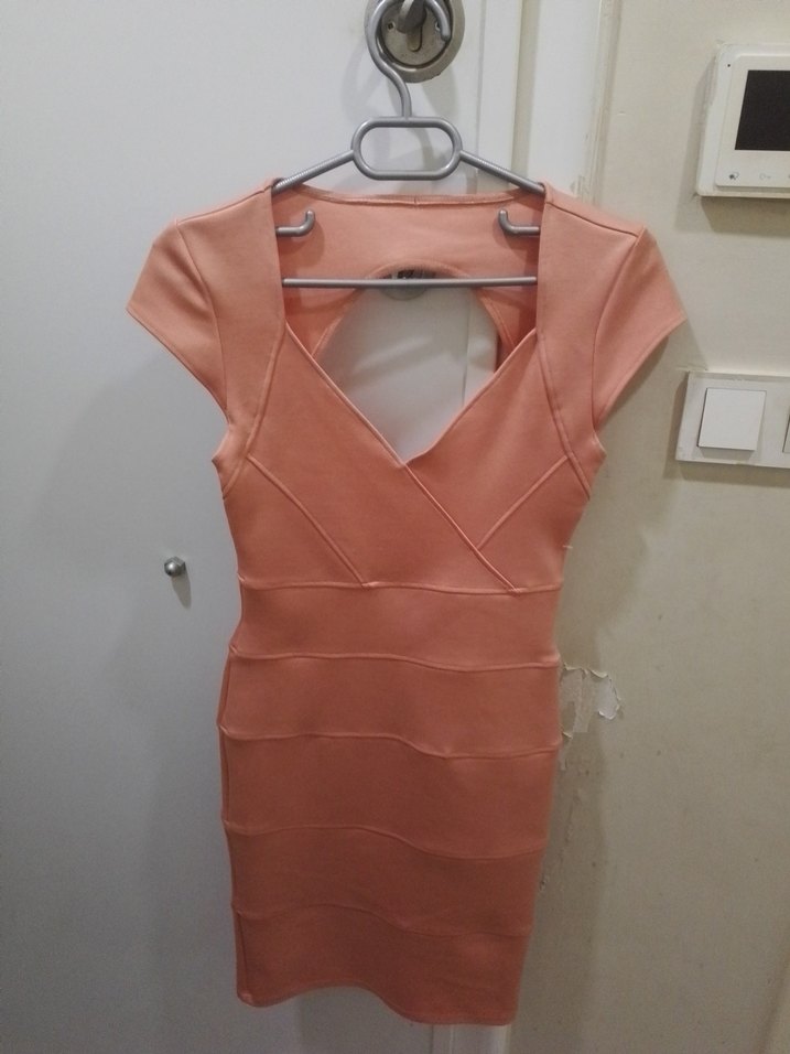 Pudra renginde, V yakalı ve kısa kollu, vücuda oturan midi elbise. Pliseli detaylarıyla günlük kullanıma uygun şık bir seçenek.