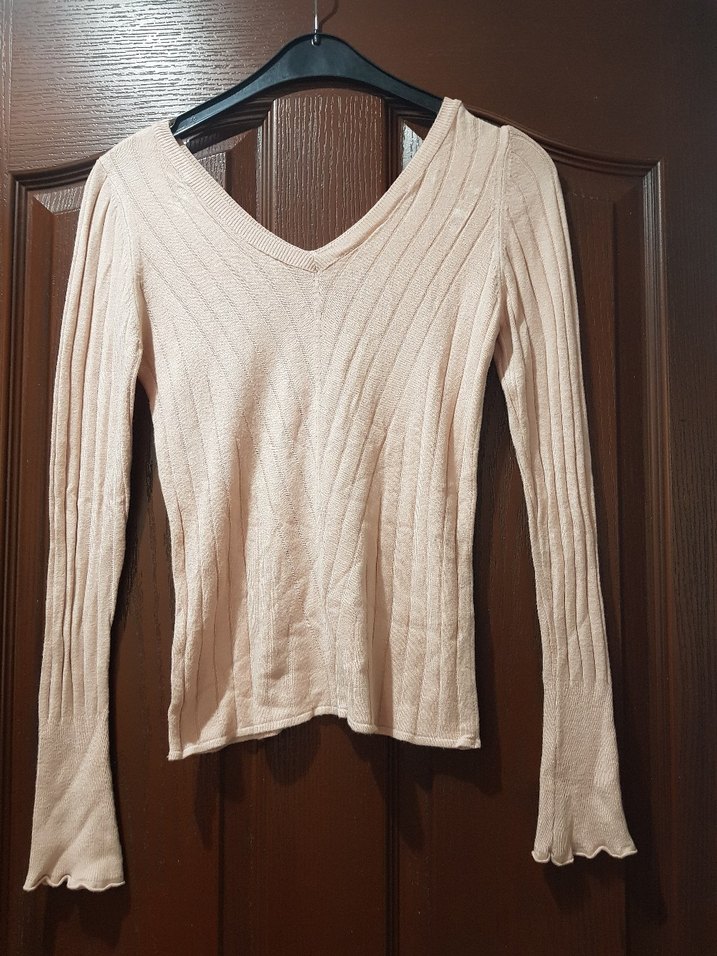 pudra renkli, v yaka ve uzun kollu fit kesim fitilli triko kazak. Yumuşak örgü kumaşıyla rahat ve sıcak, günlük sokak tarzına uygun pastel tonlarda midi boy. markasını kesmiştim ama Koton diye hatırlıyorum temsilidir