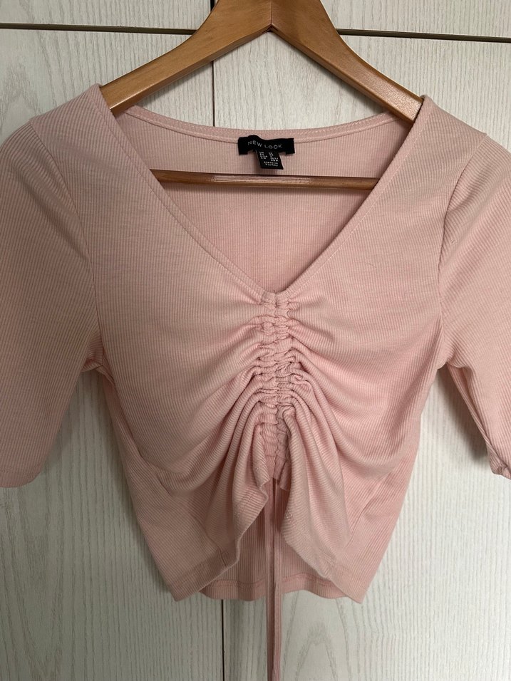 Pastel pembe renkli, pamuk, V yaka ve kısa kollu önü büzgülü tişört. Marka temsilidir. Alan kişiye şans getirsin ✨