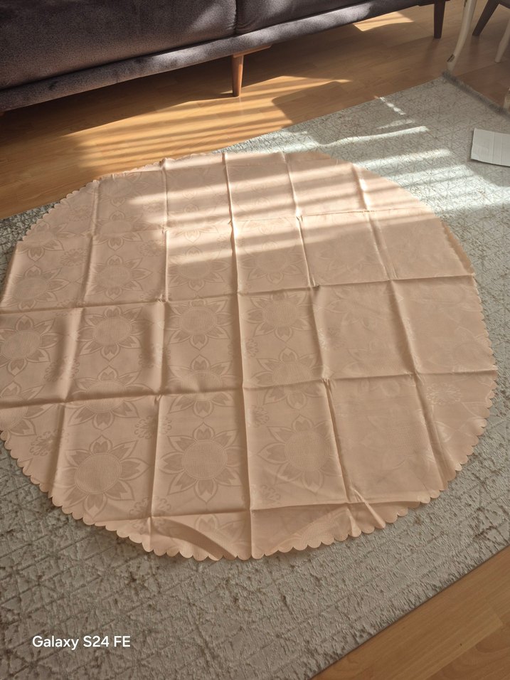 Hafif pudra renkli, yuvarlak masa örtüsü. Zarif çiçek desenleri ve dalgalı kenarları bulunur. Geleneksel tarzda ve pürüzsüz dokulu. #masaörtüsü