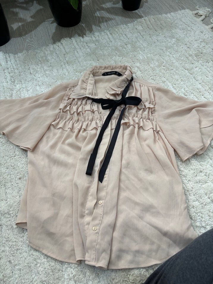 Pudra kumaştan, kısa kollu, fırfır detaylı, yakalı ve siyah kurdeleli bol kesim gömlek. Pastel tonları ve bohem tarzıyla günlük kullanıma uygundur.