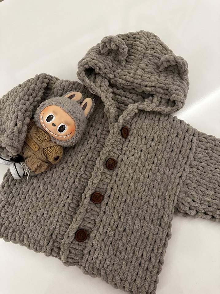 Gri renkte, ayıcıklı kapüşon ve ahşap düğmelerle tasarlanmış örgü çocuk hırkası. Uzun kollu ve bol kesimdir.
