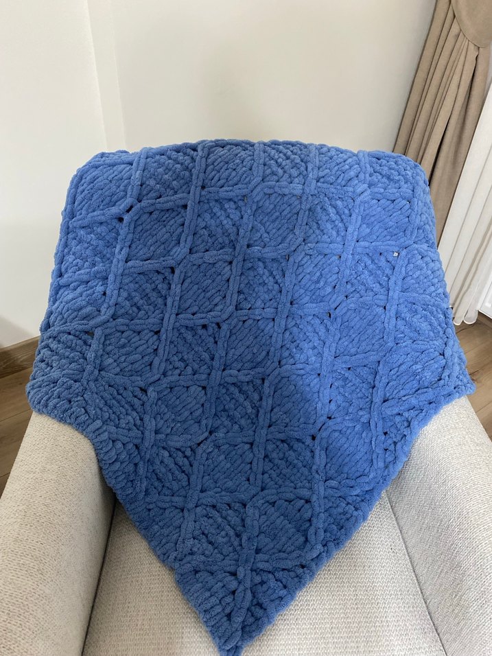 Mavi renkli, dokulu örgü çocuk battaniyesi, sıcak ve rahat bir kullanım sağlar.