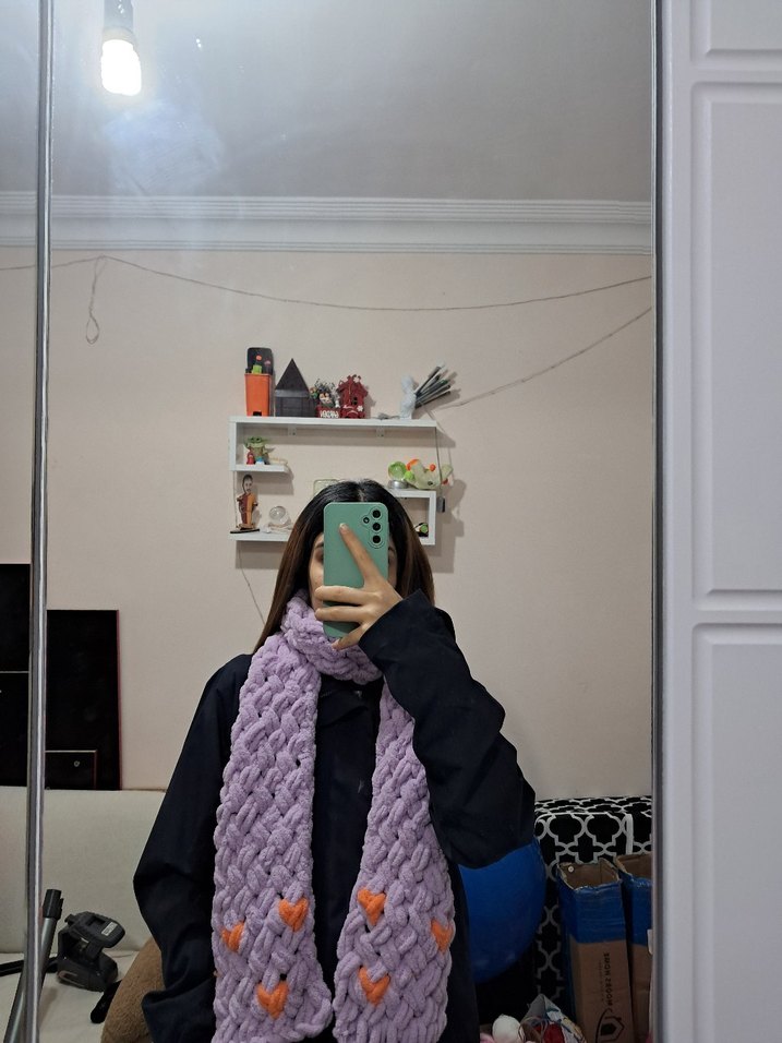 Pastel mor renkli, örgü dokulu, küçük turuncu detaylara sahip kadın şalı, rahat ve trend bir görünüm sunar.