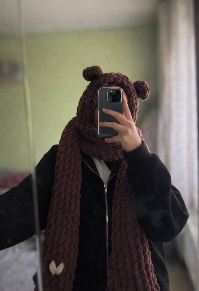 Koyu kahverengi örgü kadın atkı, yumuşak dokusu ve küçük kalp detayı ile sokak stiline uygun rahat bir kullanıma sahiptir.