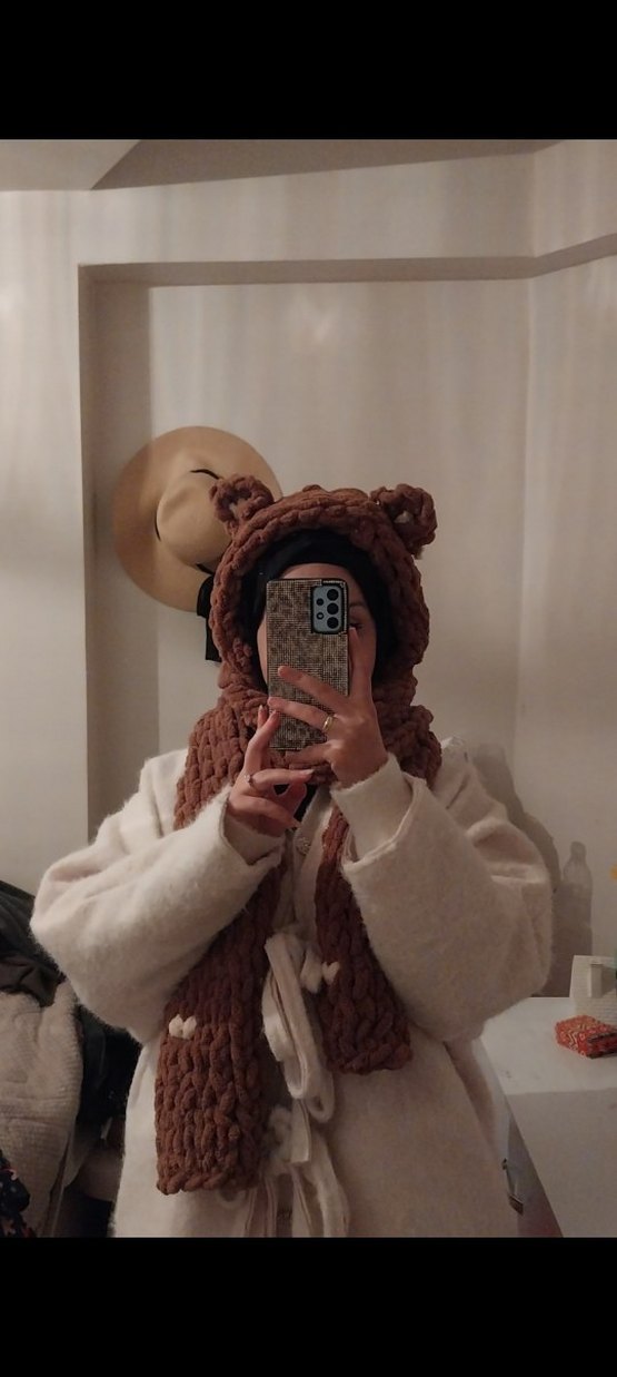 Yumuşak örgüden yapılmış kahverengi, ayı kulaklı rahat kadın bere. Bohem ve retro tarzlara uygundur.