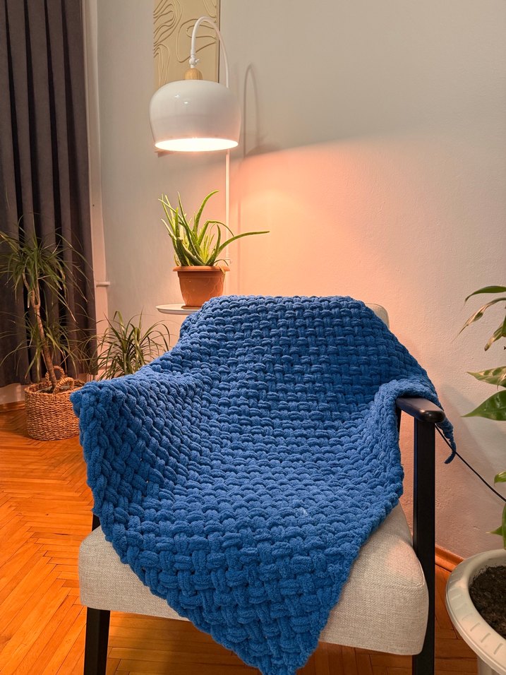 Koyu mavi renkli, yumuşak ve rahat dokulu örgü çocuk battaniyesidir. Hiç kullanılmadı ölçü 90x90