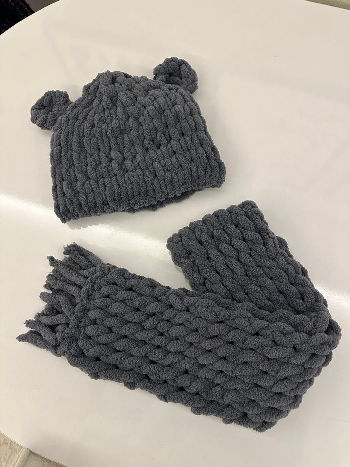 Gri renkli, sevimli ayıcık kulaklı örgü çocuk bere ve kalın örgü atkı seti. 6 yaş için uygundur, istenilen yaş ölçülerine göre kişiye özel hazırlanmaktadır.