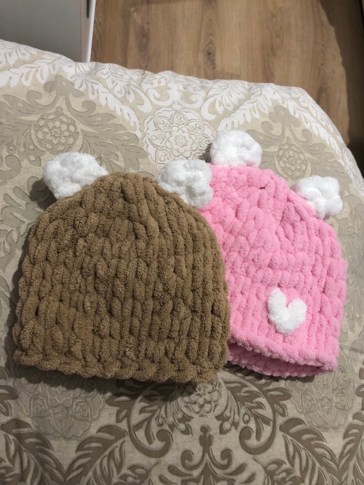 Pastel bej ve pembe renklerde, beyaz nakışlı kalp detaylı çocuk bere. Yumuşak örme kumaştan, bohem tarzda. İstediğiniz renk ve ölçülerde örülür.