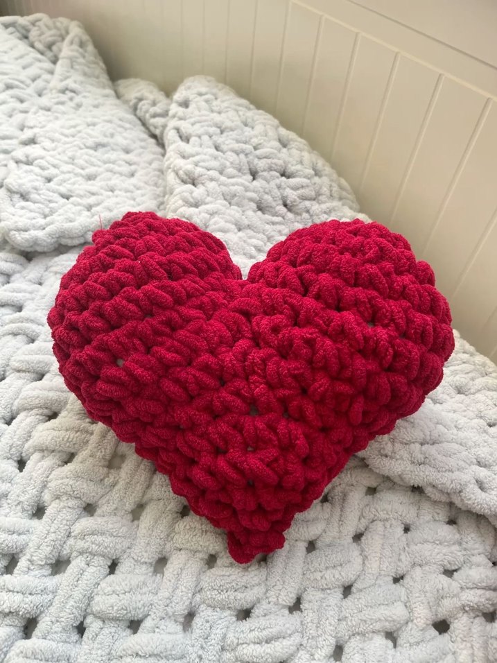 Nakışlı dokulu kırmızı kalp şeklinde yastık, yumuşak gri örgü battaniye üzerinde. Rahat bir dokunuş katmak için idealdir. Yumuşacık el emeği istenilen renk ve boyda yapılır