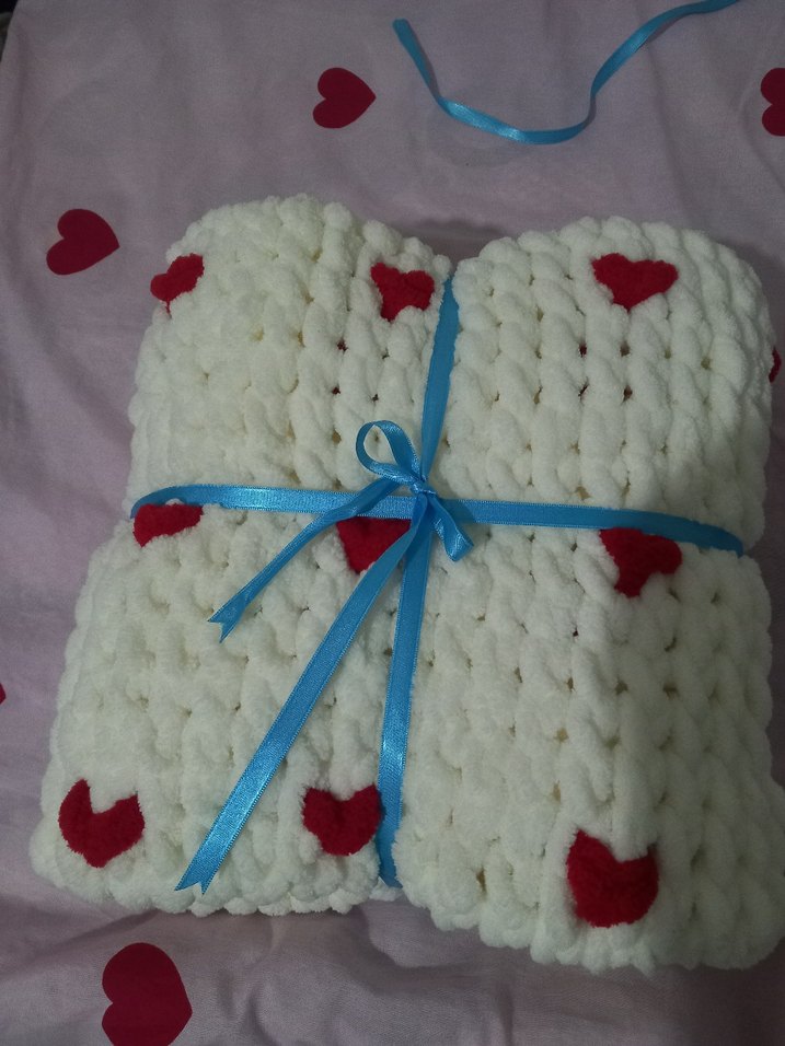 Burgu model, renkli kalplerle süslenmiş beyaz örgü bebek battaniyesi. Yumuşak ve rahat bir dokusu vardır sıcacık tutar. İstenilen renk ve modelde örülür.
