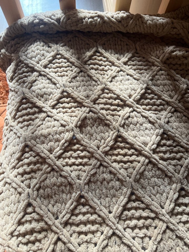 Vizon renkli, yumuşak dokulu örgü çocuk battaniyesi, baklava desenleriyle sıcaklık ve konfor sunar.