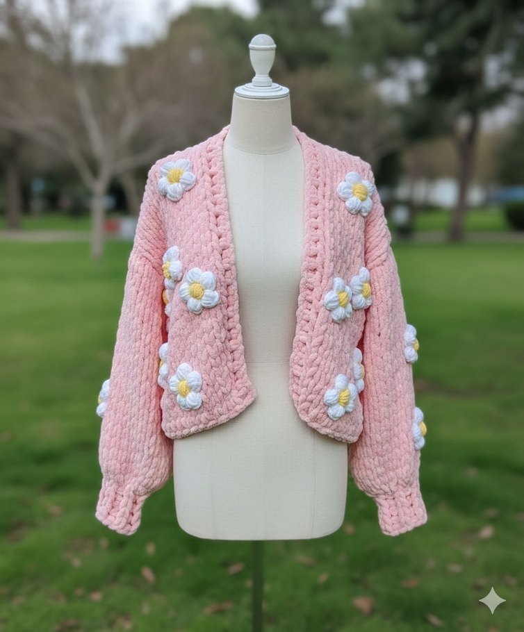 Yumuşak dokulu, pofuduk örgü hırka. El emeği, 3D papatya aplikeli. Standart beden (Oversize kesim). Leke, sökük veya herhangi bir kusuru yoktur. Kış ve bahar ayları için ideal, sıcak tutan bir yapıdadır. #papatyahırka #elörgüsü #vintage #oversize #cardigan