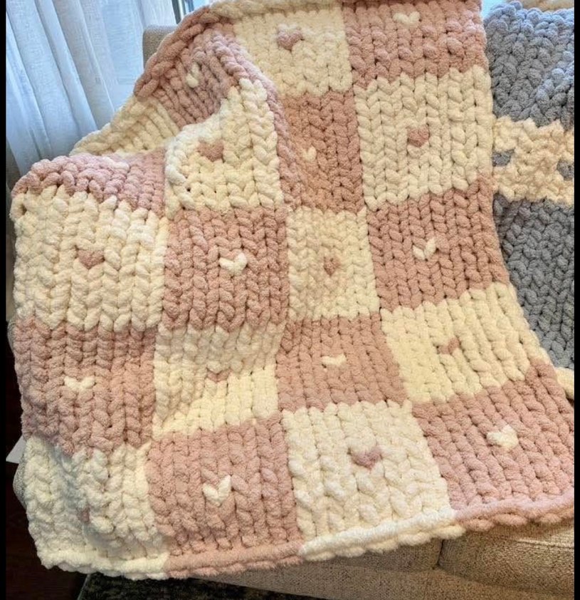 Pembe ve krem tonlarında pastel kareli, kalın örgü dokusuyla yumuşak battaniye.