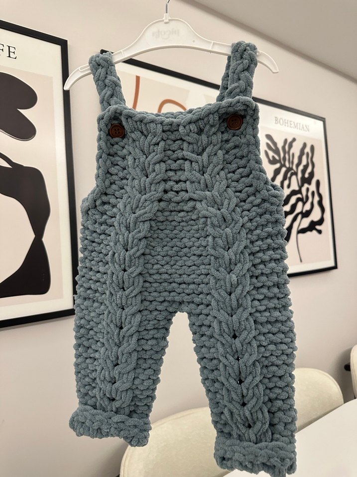 Gri puffy örgü çocuk salopet, bol kesim ve askılı tasarıma sahiptir. 6-9 ay uyumludur. Bohem tarzı ve kalın örme deseniyle sıcacık tutar.