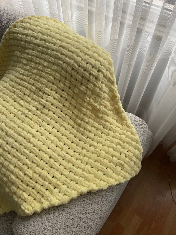 Pastel sarı renkte, puffy ipten el örgüsü ölçüleri : 85-90 İstenilen renkte çalışılabilir. Diz veyahutta bebek battaniyesi olarak kullanılabilir.